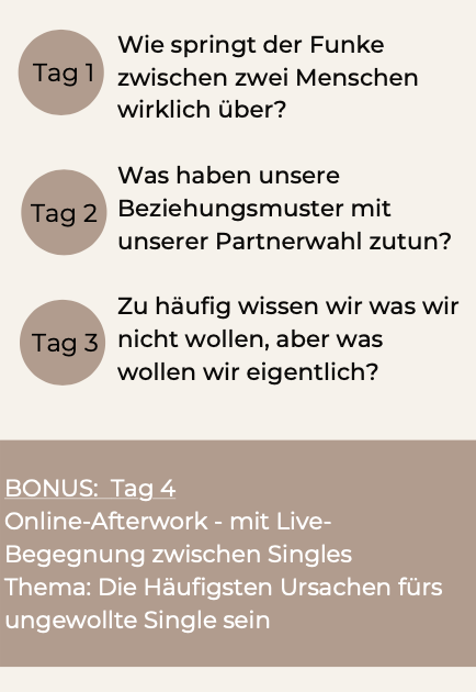 In der Challenge lernen wir z.B. gemeinsam, was den Funken zwischen zwei Menschen übersprühen lässt, wie unsere Beziehungsmuster unsere Partnerwahl beeinflussen und was wir wirklich von der Liebe uns Wünschen.
